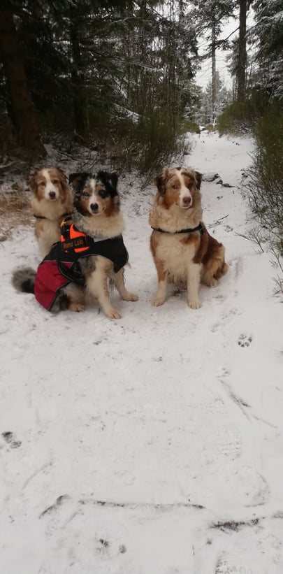 Auch die Aussiemädels aus Elisabeth´s Futterkammer wollen immer mal was besonderes. Da bietet sich im Winter das Reh- oder Hirschfleisch an. Das kommt direkt von unserem Jäger unseres Vertrauens und das gibt es auch im Laden zu kaufen. Als Alternative, wenn mal wieder nix aufgetaut ist, bietet sich auch die Loisachtaler pur Dose an. Da ist auch ganz leckerer Hirsch drin und kommt aus Oberbayern. Die Firma Loisachtaler produziert auch selbst , so das ich da ein gutes Gefühl habe. Da meine Wauzies im Winter immer gescheit Hunger haben kommt noch eine gute Portion angeweichte Buchweizenflocken mit ins Futter. Das macht schön satt und hat viele Vitamine und Mineralstoffe. Buchweizen ist kein Getreide und wird auch von vielen Allergikern gut vertragen. Apropos Vitamine, auch in unseren heimischen Wintersalaten stecken viel Vitamine und Mineralstoffe. Da sie für Mensch und Hund gut sind, bietet es sich an zu teilen. Die äußeren Blätter für die Hunde und den Rest für uns. Und schon haben beide was davon. Den Salat bitte gut pürieren damit es die Hunde besser verdauen können. Die ungesättigten Fettsäuren und vor allem eine gute Portion Vitamin D liefert unser Omega plus Öl. Das tut den ganzen Organismus gut, vor allem im Winter wenn die Sonne fehlt. Also meine Aussies freuen sich schon auf ihr Reh. Nun wünschen euch viel Spaß beim nachmachen und euren Wauzies einen guten Appetit, Elisabeth und die ganze Aussiebande.